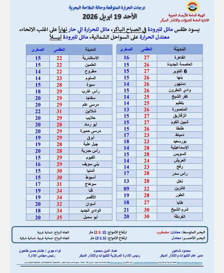 درجات الحرارة العظمى والصغرى المتوقعة اليوم الأحد 19 أبريل 2026