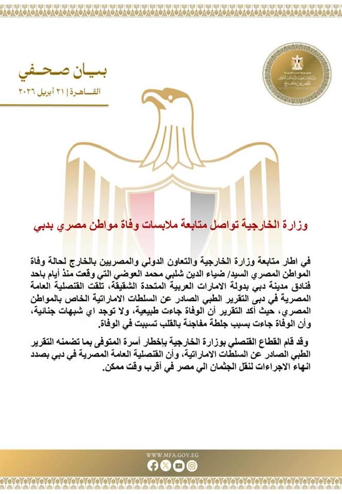 واستكمل البيان، أن القطاع القنصلي بوزارة الخارجية قام بإخطار أسرة المتوفى بما تضمنه التقرير الطبي الصادر عن السلطات الاماراتية، وأن القنصلية العامة المصرية في دبي بصدد انهاء الاجراءات لنقل الجثمان إلى مصر في أقرب وقت ممكن.