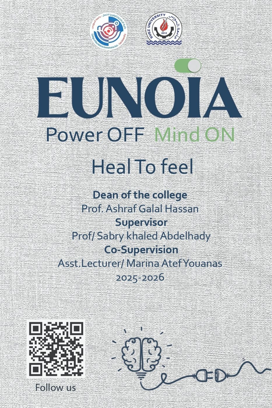 أطلق طلاب الفرقة الرابعة بقسم الاتصالات التسويقية المتكاملة بكلية الإعلام – جامعة السويس الصفحة الرسمية لمشروع تخرجهم بعنوان “EUNOIA” على منصات التواصل الاجتماعي، وذلك تحت رعاية أ.د أشرف جلال عميد الكلية.