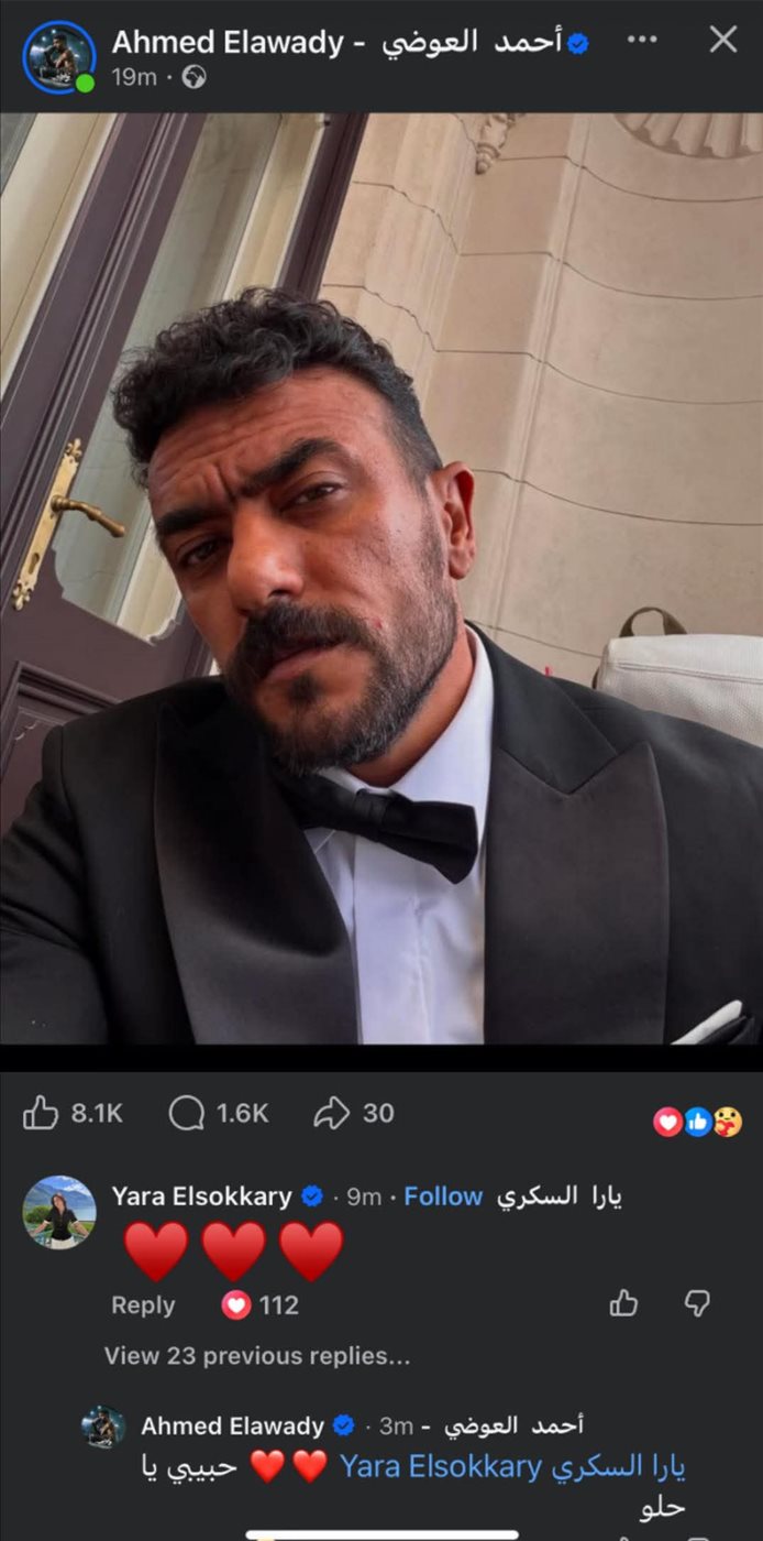 وتفاعلت الفنانة يارا السكري مع الصورة، حيث علّقت بعدد من القلوب، ليرد عليها العوضي قائلًا: "حبيبي يا حلو"، وهو ما لفت انتباه المتابعين بشكل كبير.