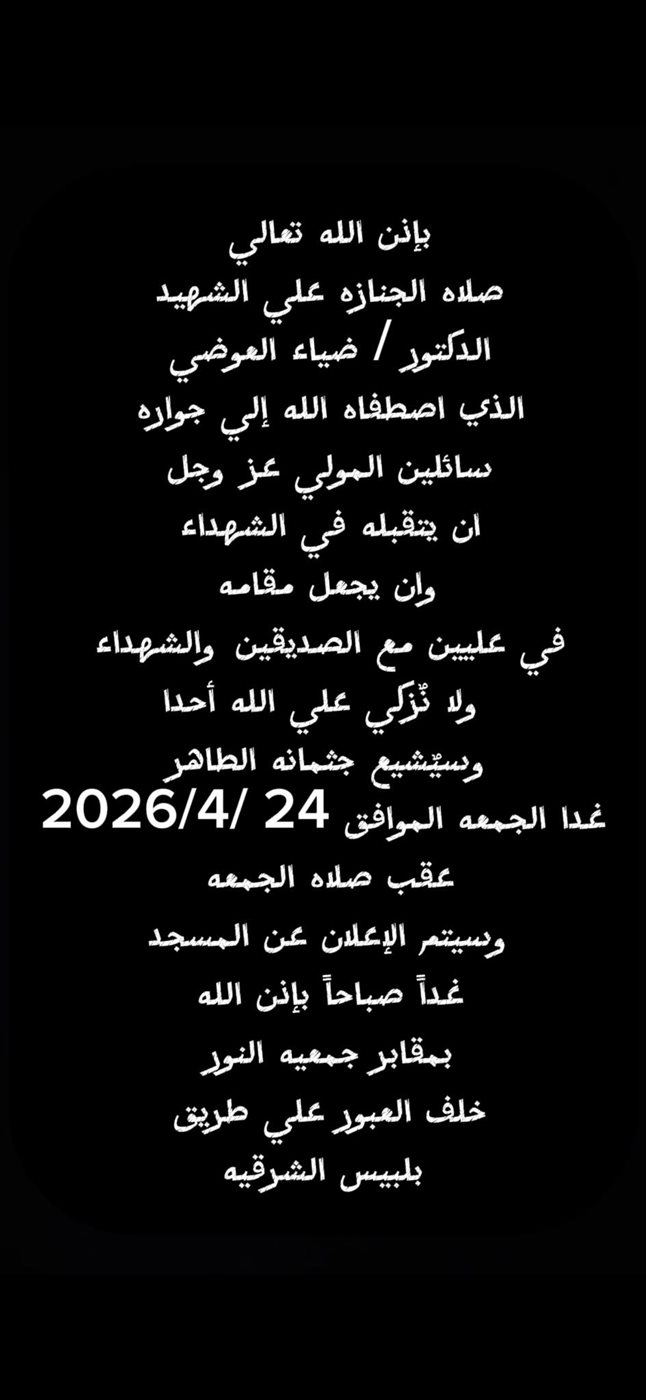 أعلنت الصفحة الرسمية للدكتور الراحل ضياء العوضي، تفاصيل موعد ومكان تشييع جثمانه، حيث من المقرر إقامة صلاة الجنازة عليه عقب صلاة الجمعة غدًا الموافق 24 أبريل 2026.