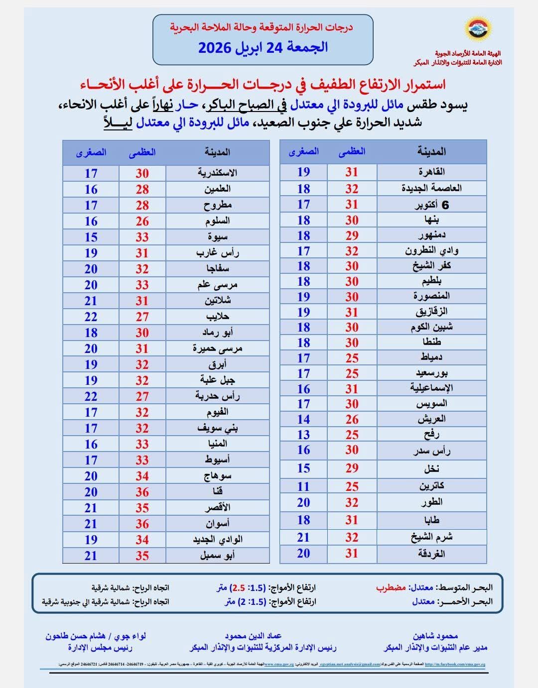وأوضحت هيئة الأرصاد درجات الحرارة العظمى والصغرى المتوقعة، اليوم، على النحو التالي: