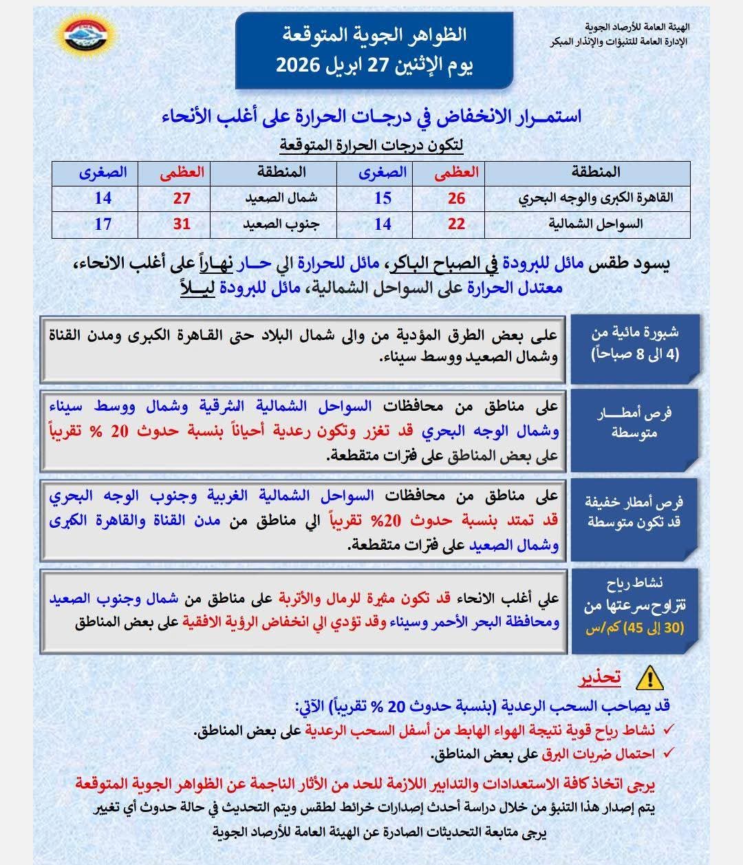 كشفت الهيئة العامة للأرصاد الجوية، حالة الطقس المتوقعة اليوم الاثنين 27 أبريل 2026، حيث يسود انخفاض في درجات الحرارة على أغلب الأنحاء.