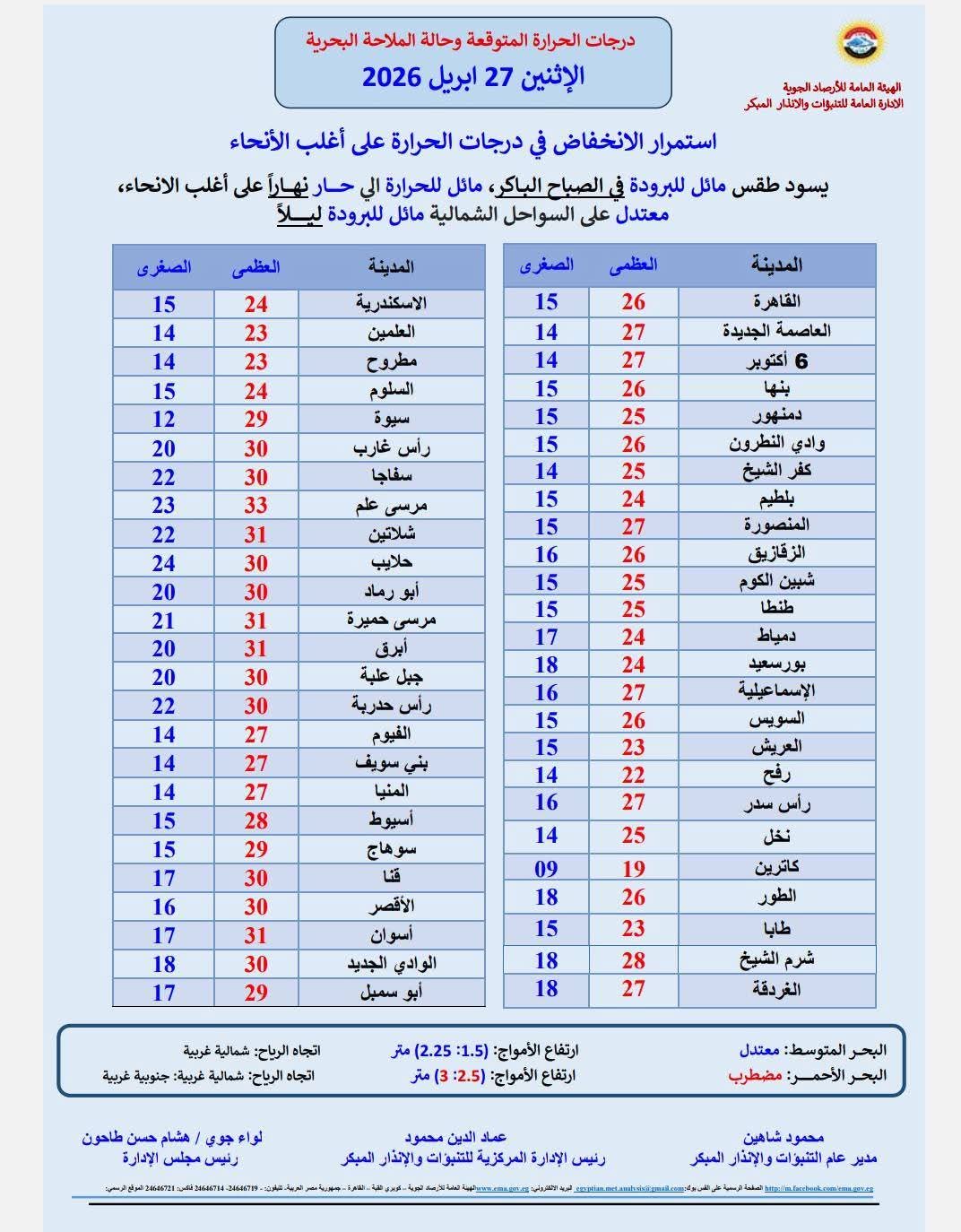درجات الحرارة العظمى والصغرى المتوقعة اليوم الاثنين 27 أبريل 2026
