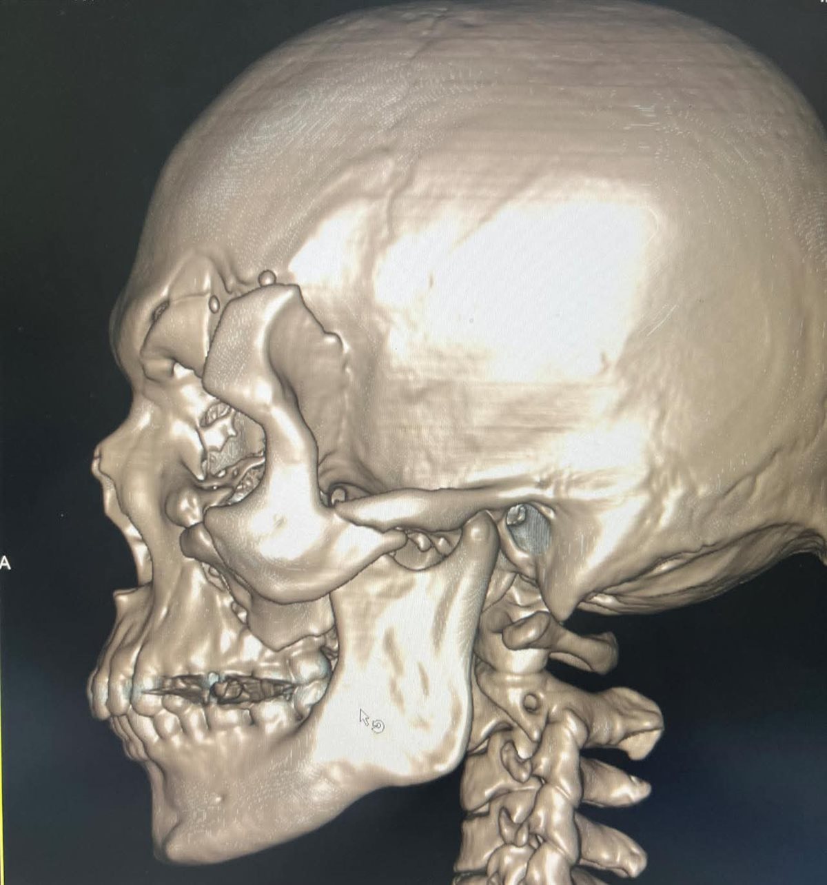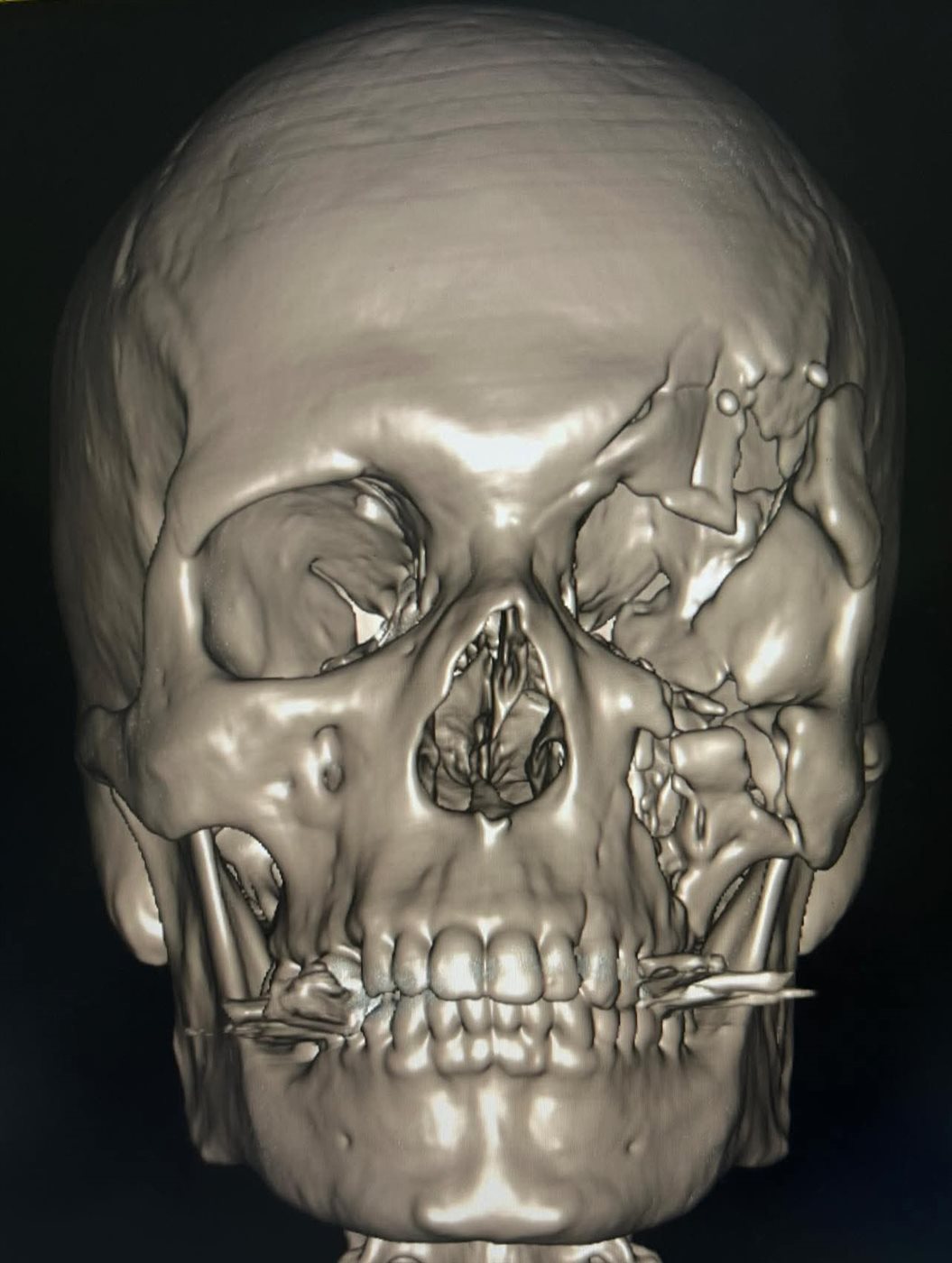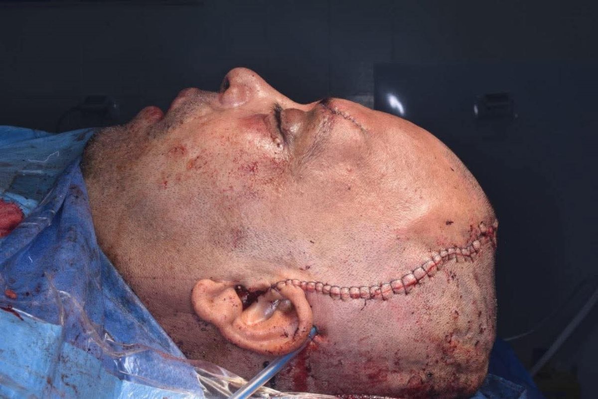 كما تم إعادة بناء محجر العين والجيب الأنفي باستخدام عظام ذاتية من المريض (Autogenous Bone Graft) مع تدعيمها بشبكة تيتانيوم، إلى جانب إعادة تثبيت عظام الوجه والجمجمة باستخدام الشرائح والمسامير لاستعادة التماثل التشريحي الكامل.