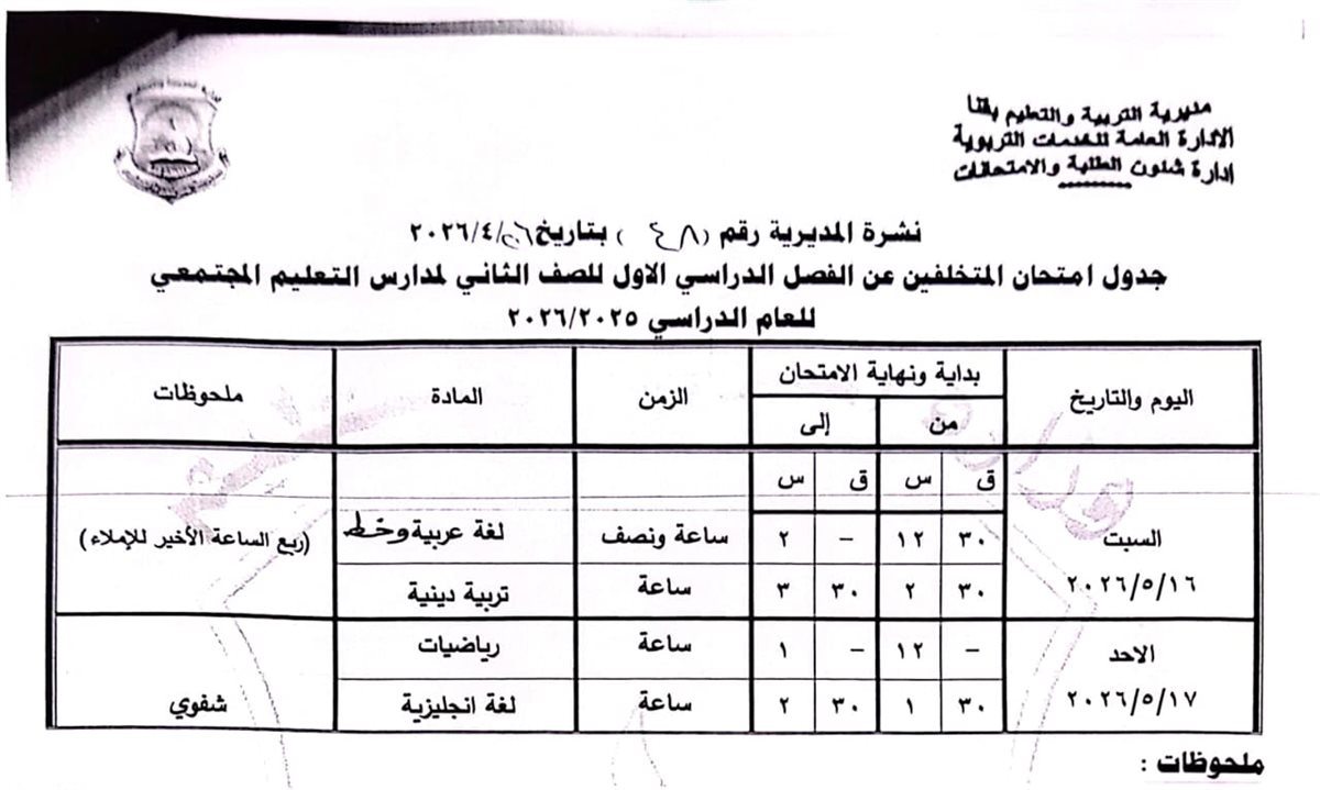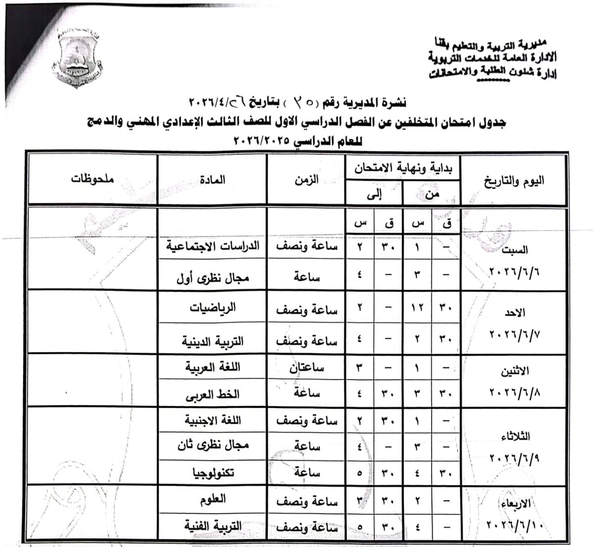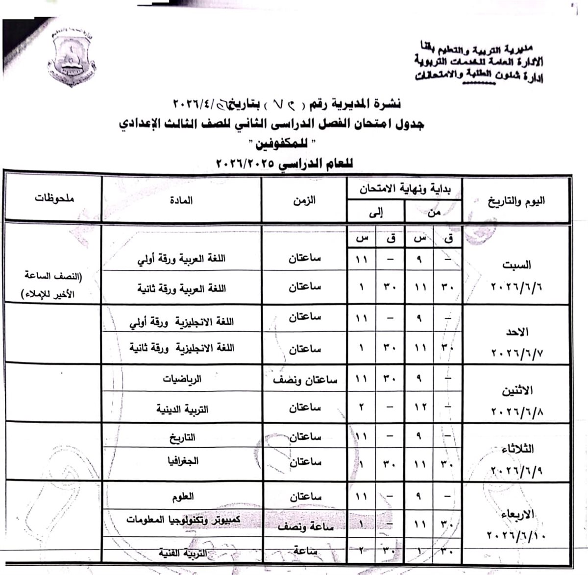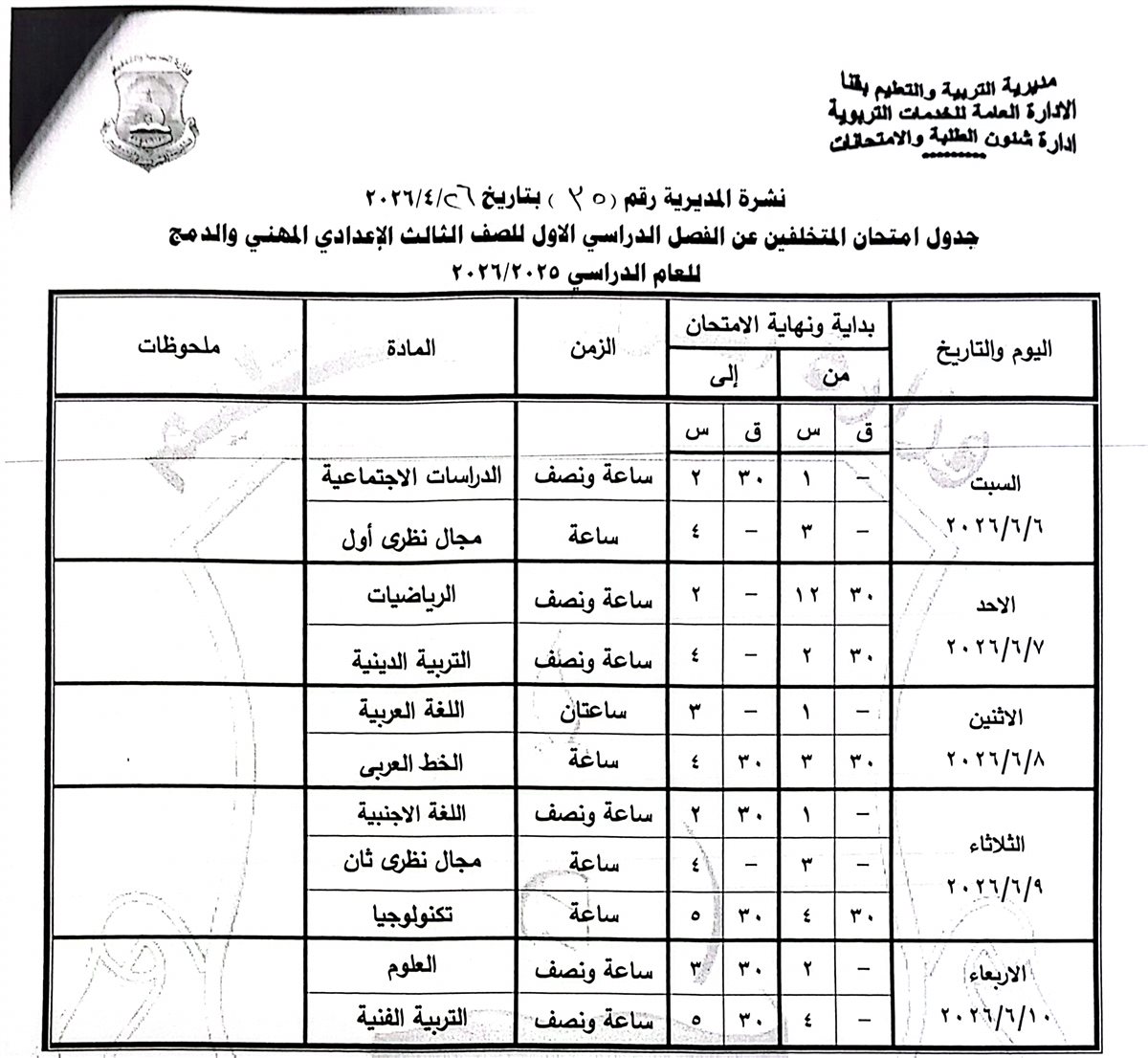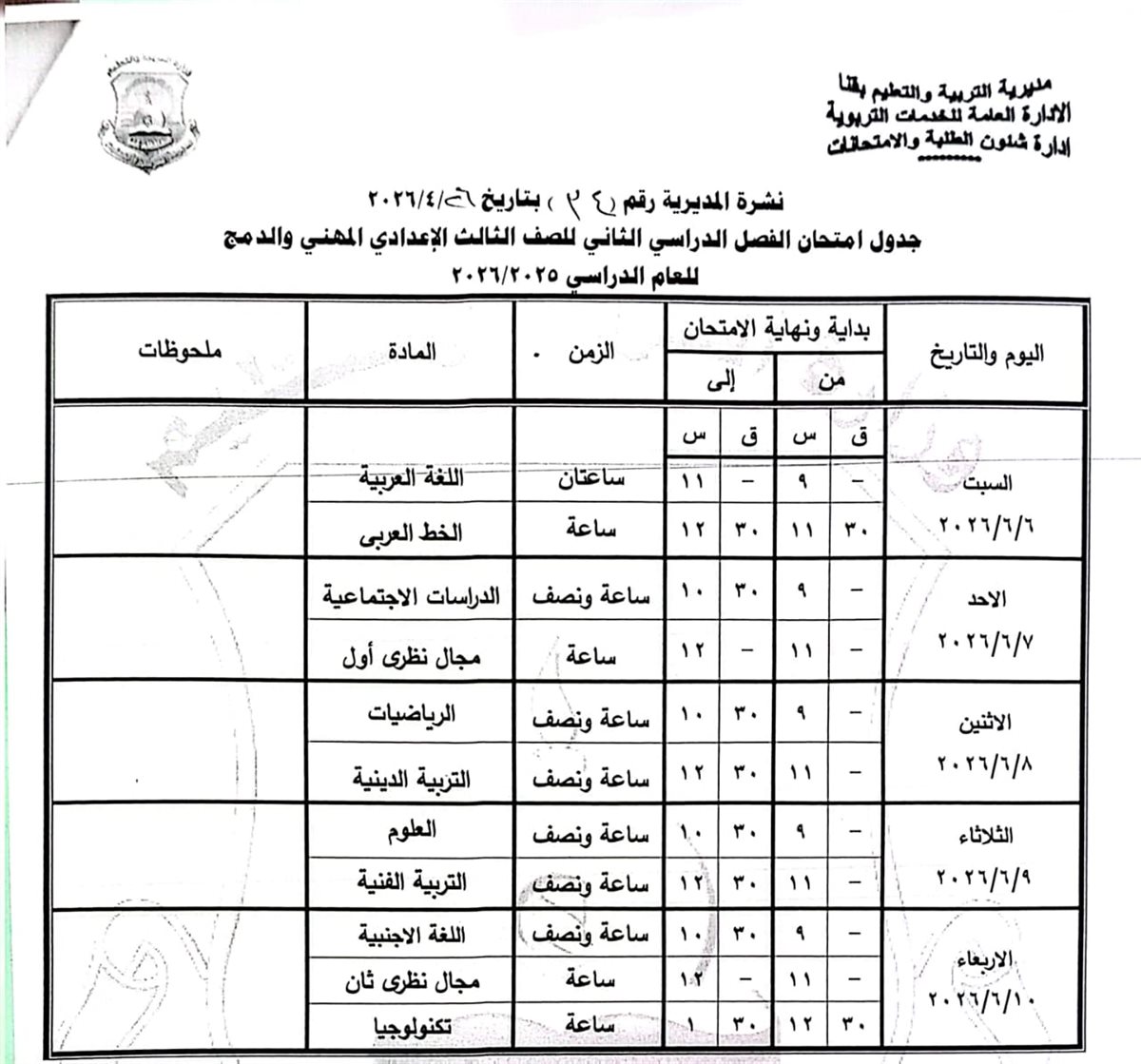 الشهادة الإعدادية (عامة ومهنية): تبدأ من السبت 6 يونيو وحتى الخميس 11 يونيو 2026.