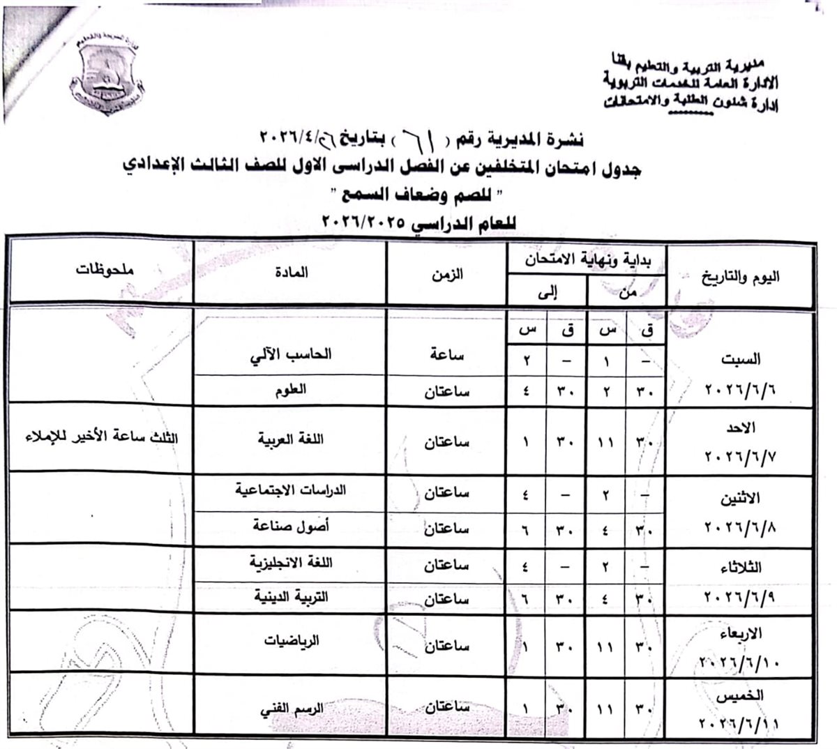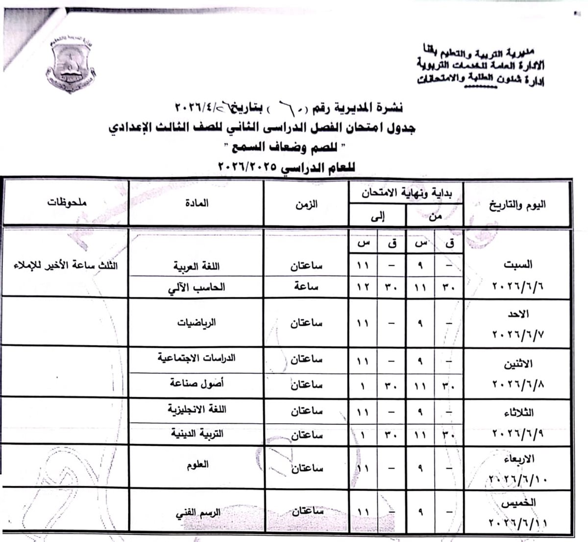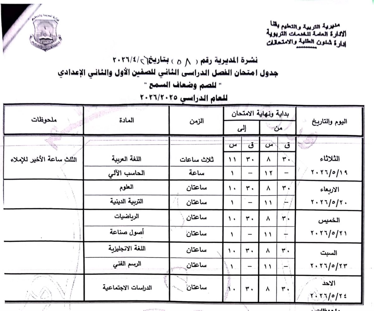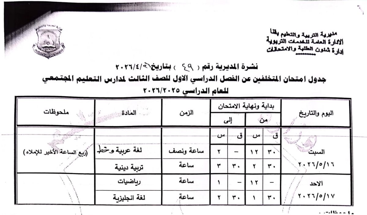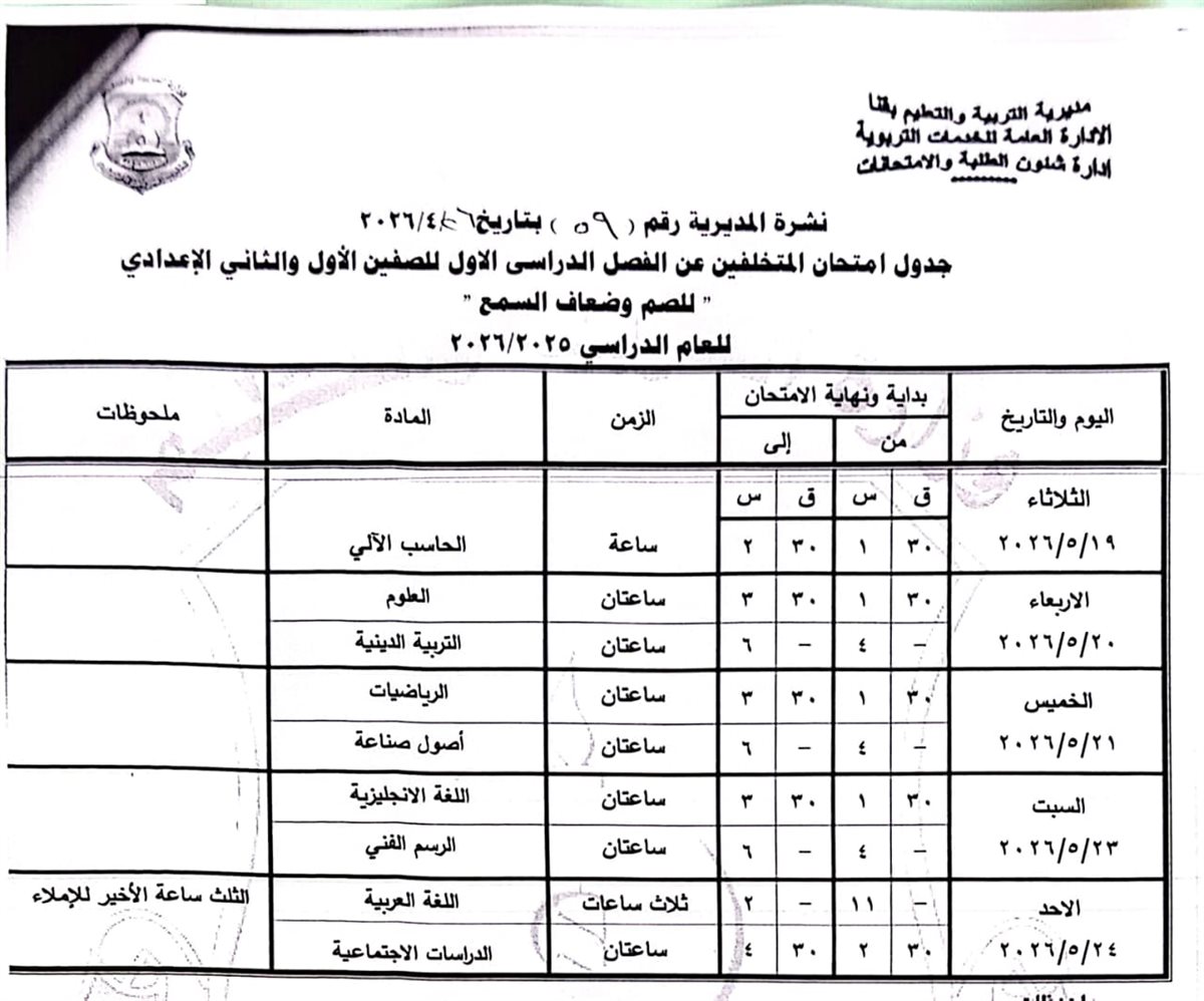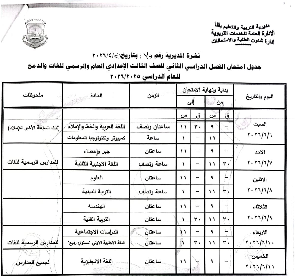 الشهادة الإعدادية (عامة ومهنية): تبدأ من السبت 6 يونيو وحتى الخميس 11 يونيو 2026.