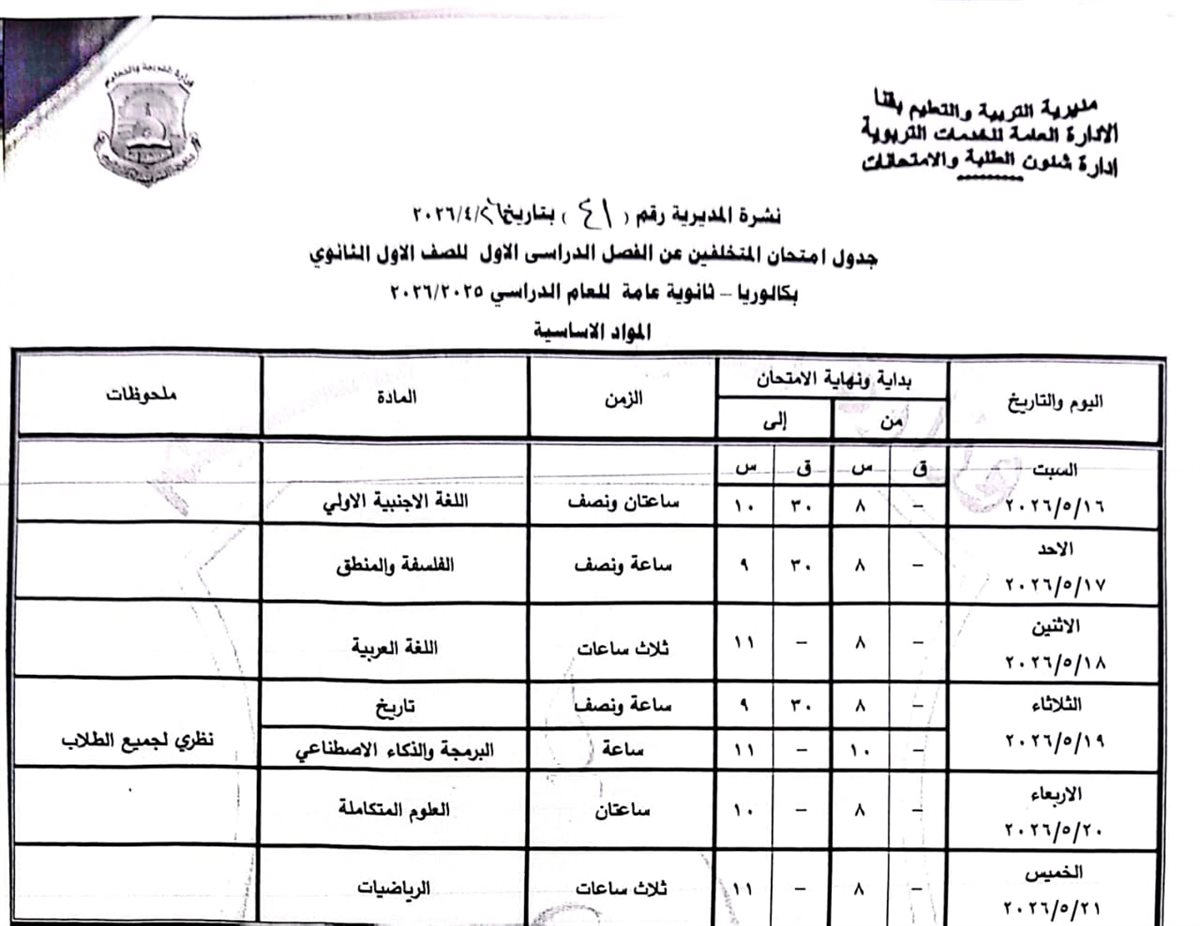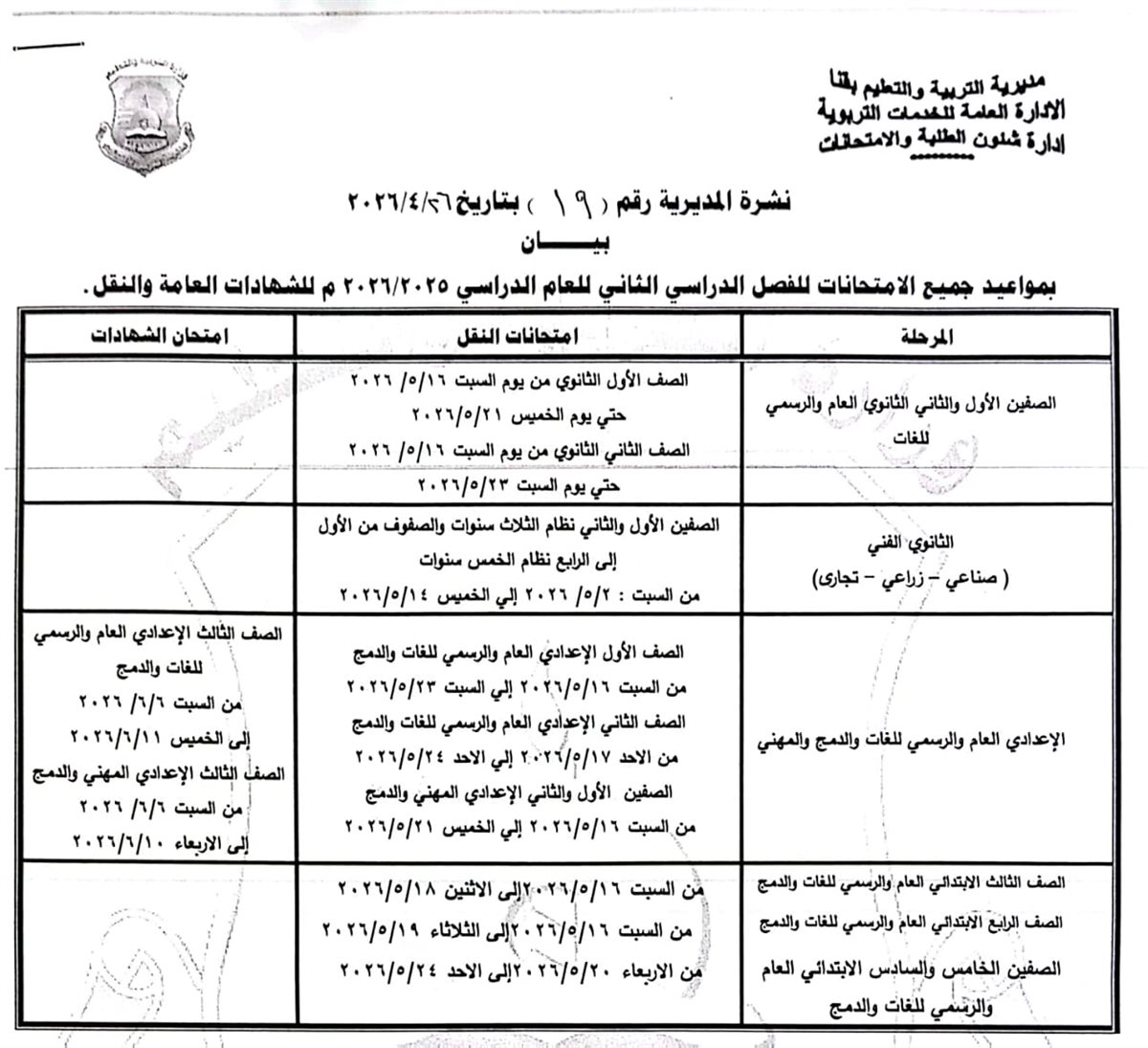 التعليم الثانوي الفني (بجميع تخصصاته): تبدأ امتحانات النقل من السبت 2 مايو وحتى الخميس 14 مايو 2026.