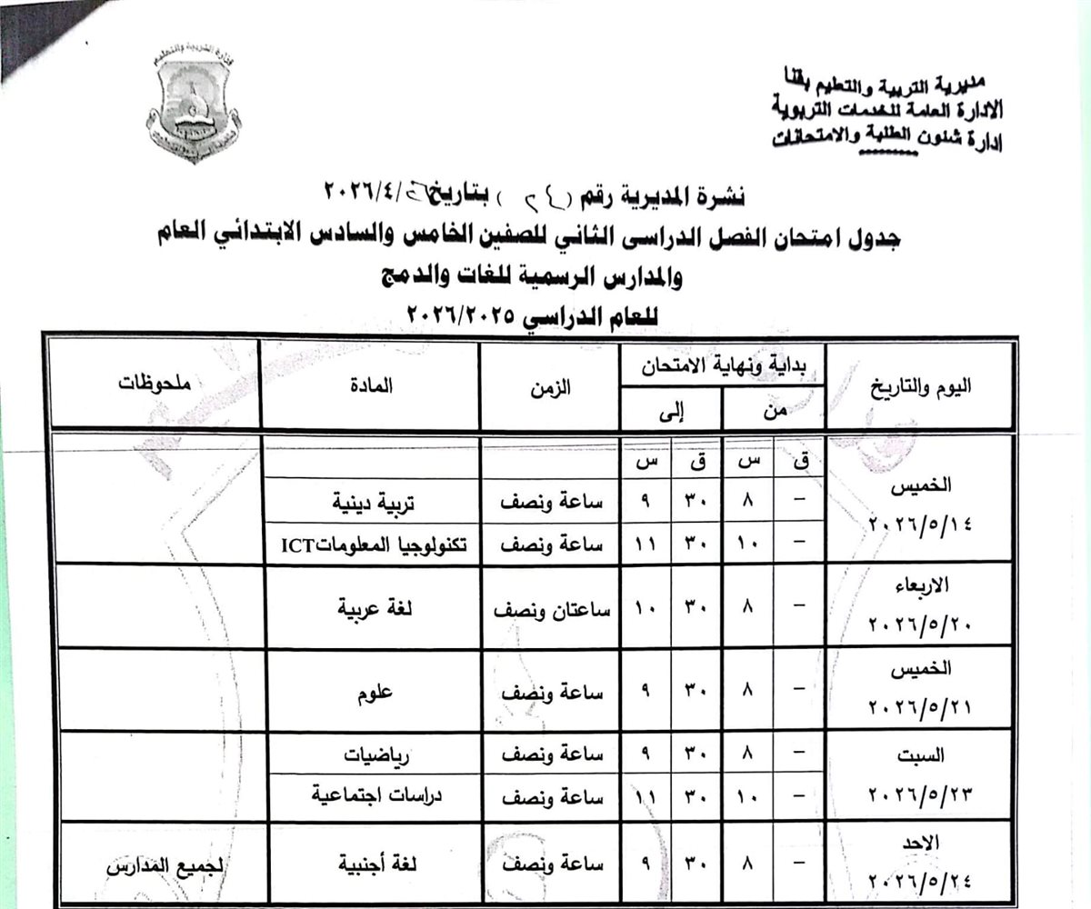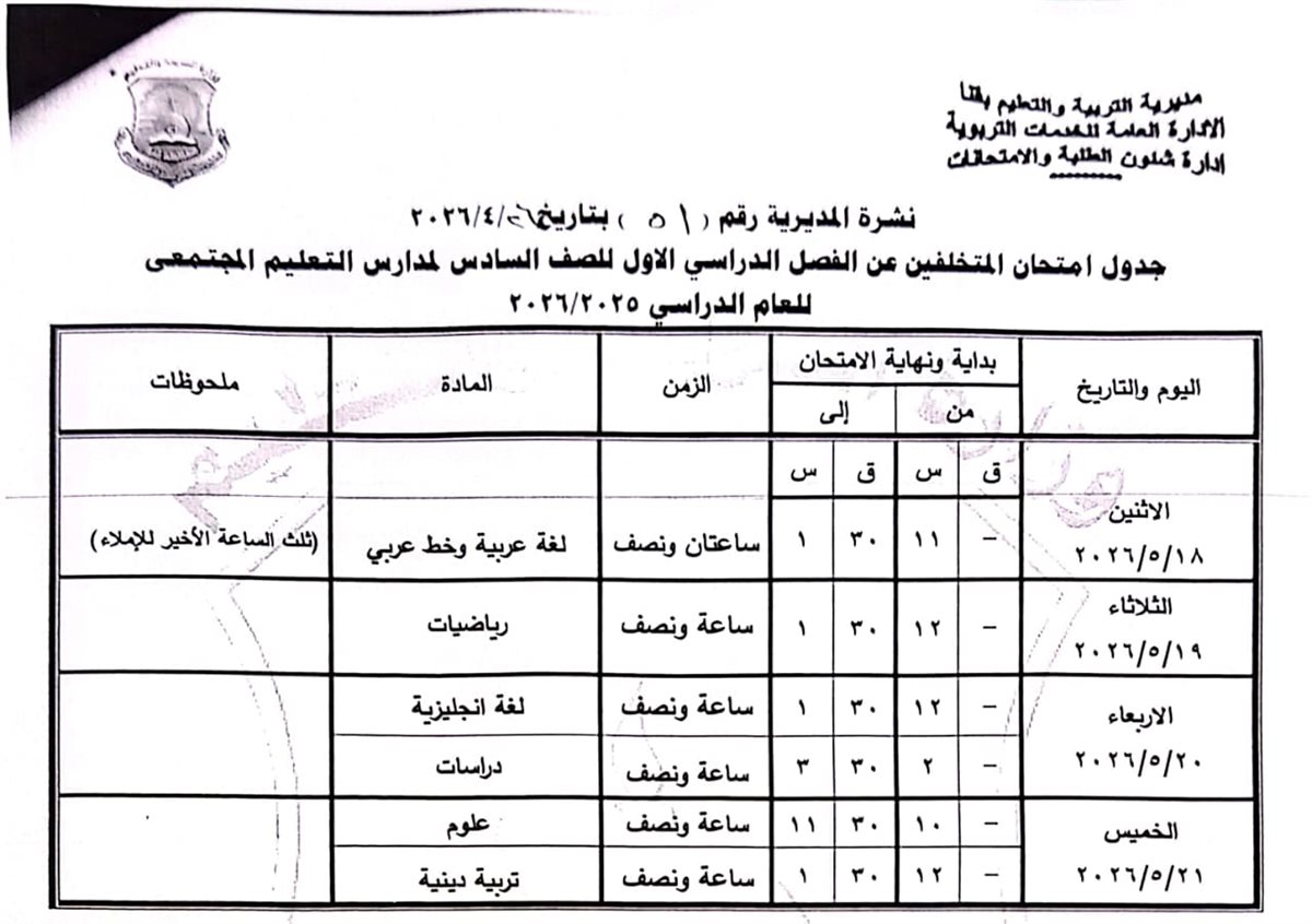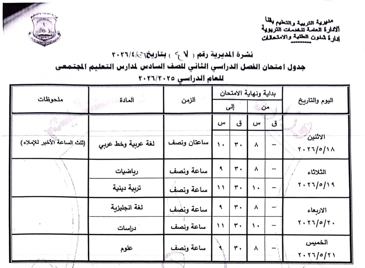 الصفين الخامس والسادس الابتدائي: من الأربعاء 20 مايو وحتى الأحد 24 مايو 2026.