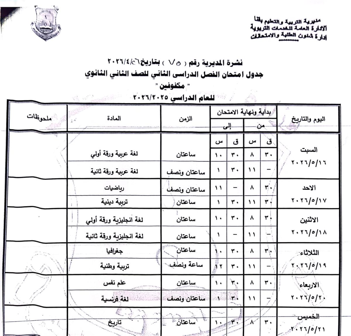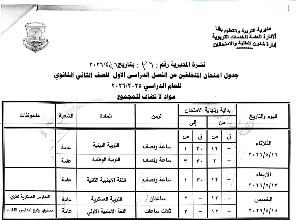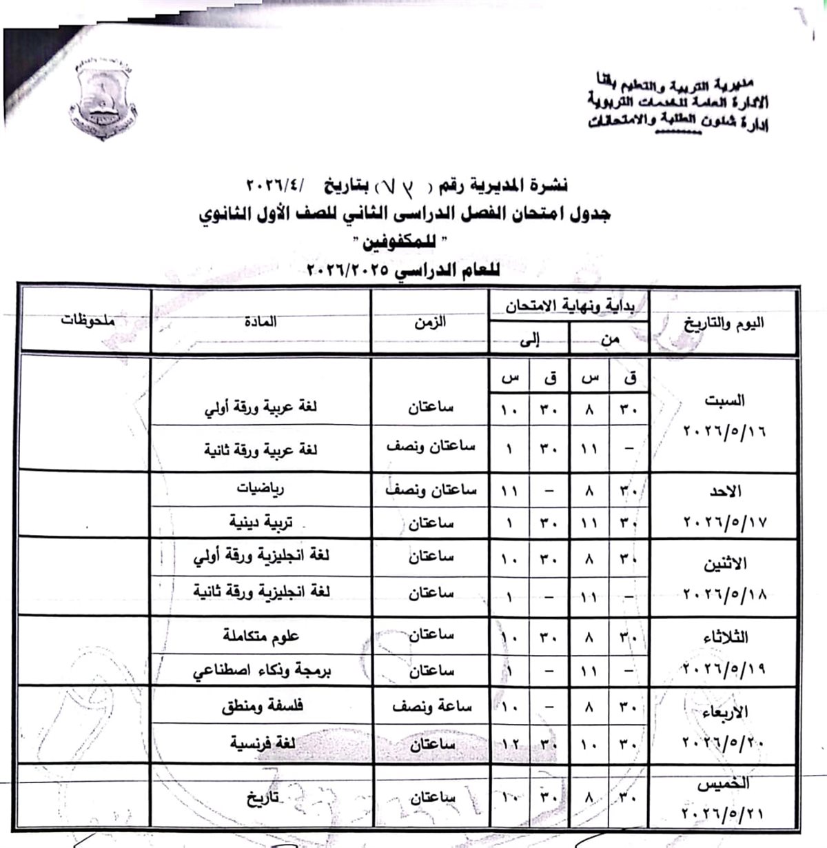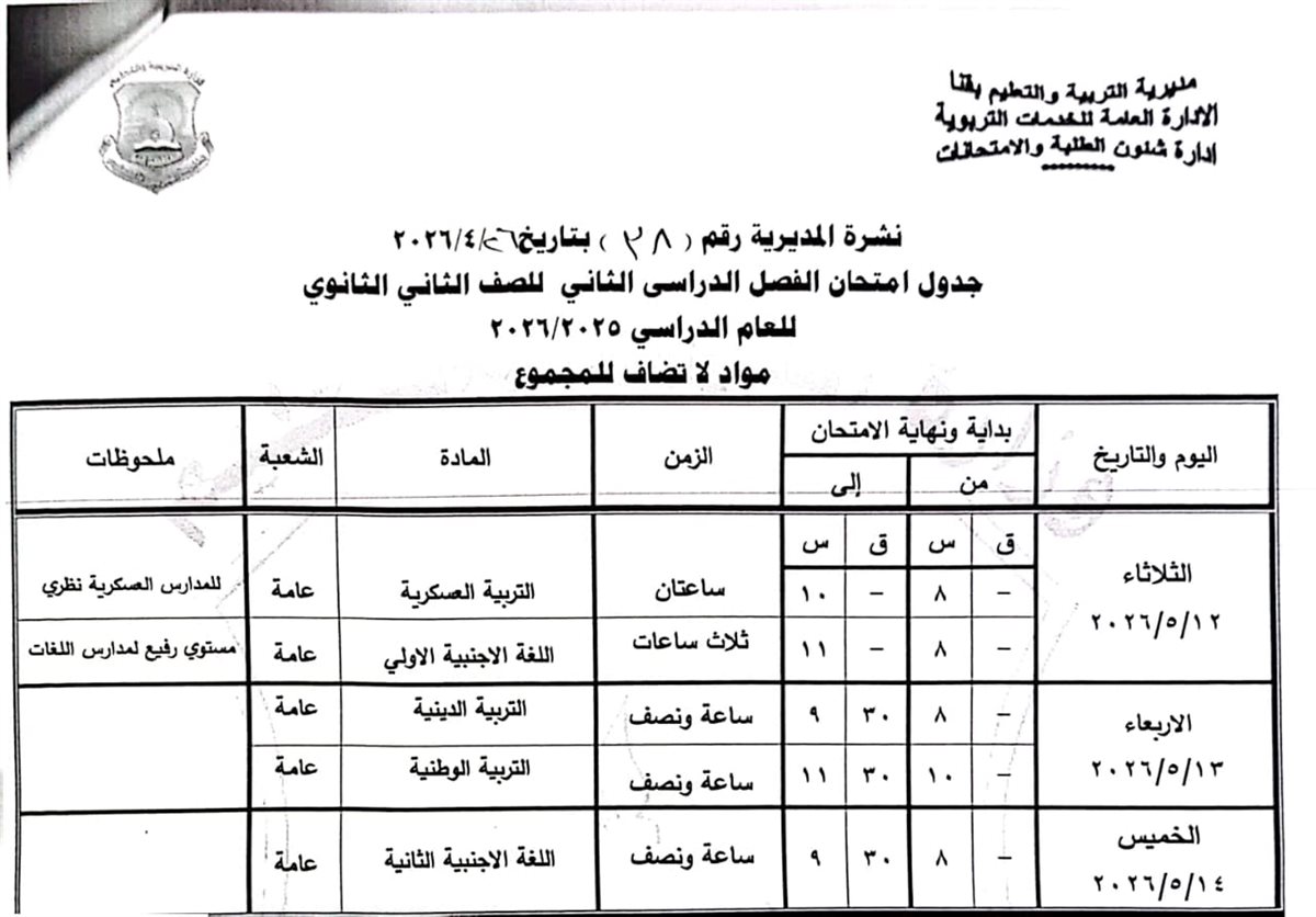 الصف الثاني الثانوي: من السبت 16 مايو وحتى السبت 23 مايو 2026.
