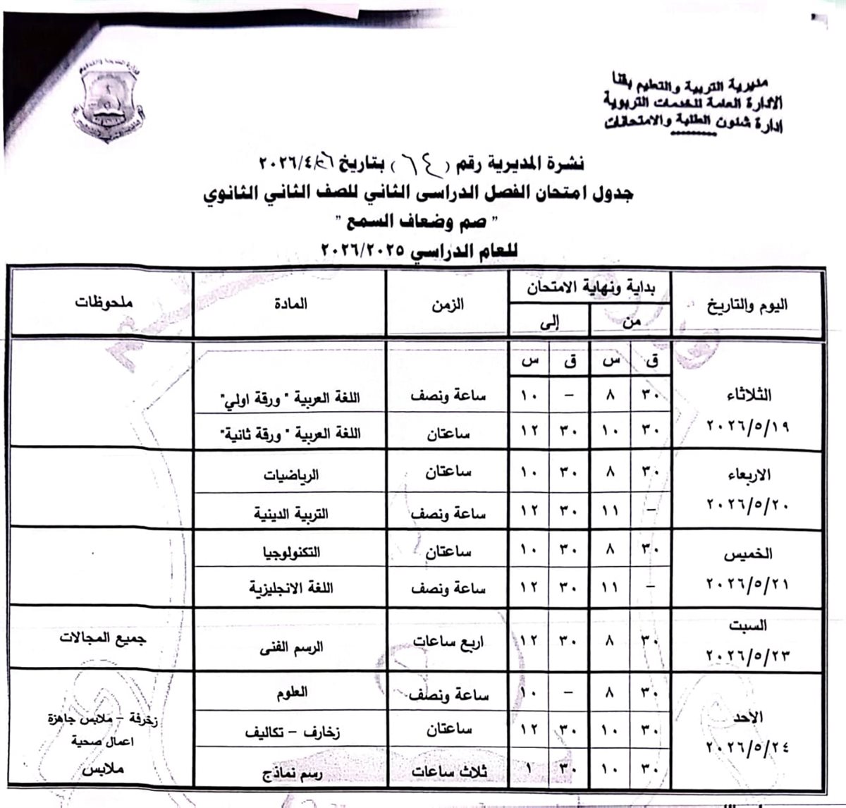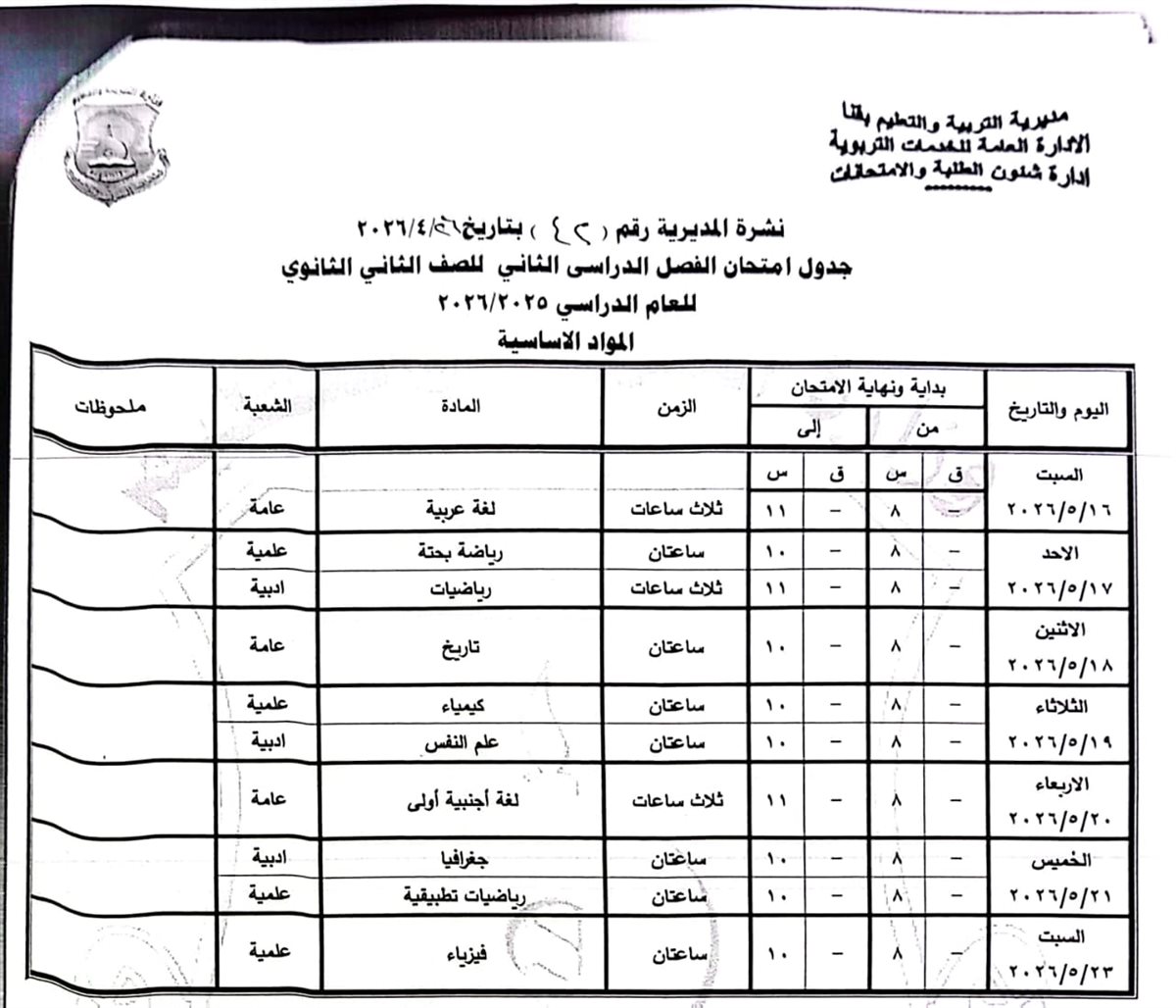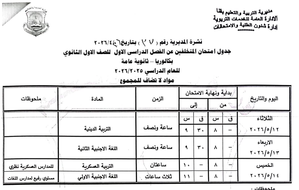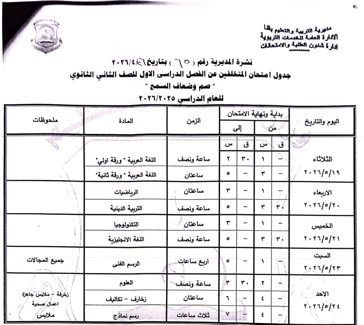 الصف الثاني الثانوي: من السبت 16 مايو وحتى السبت 23 مايو 2026.