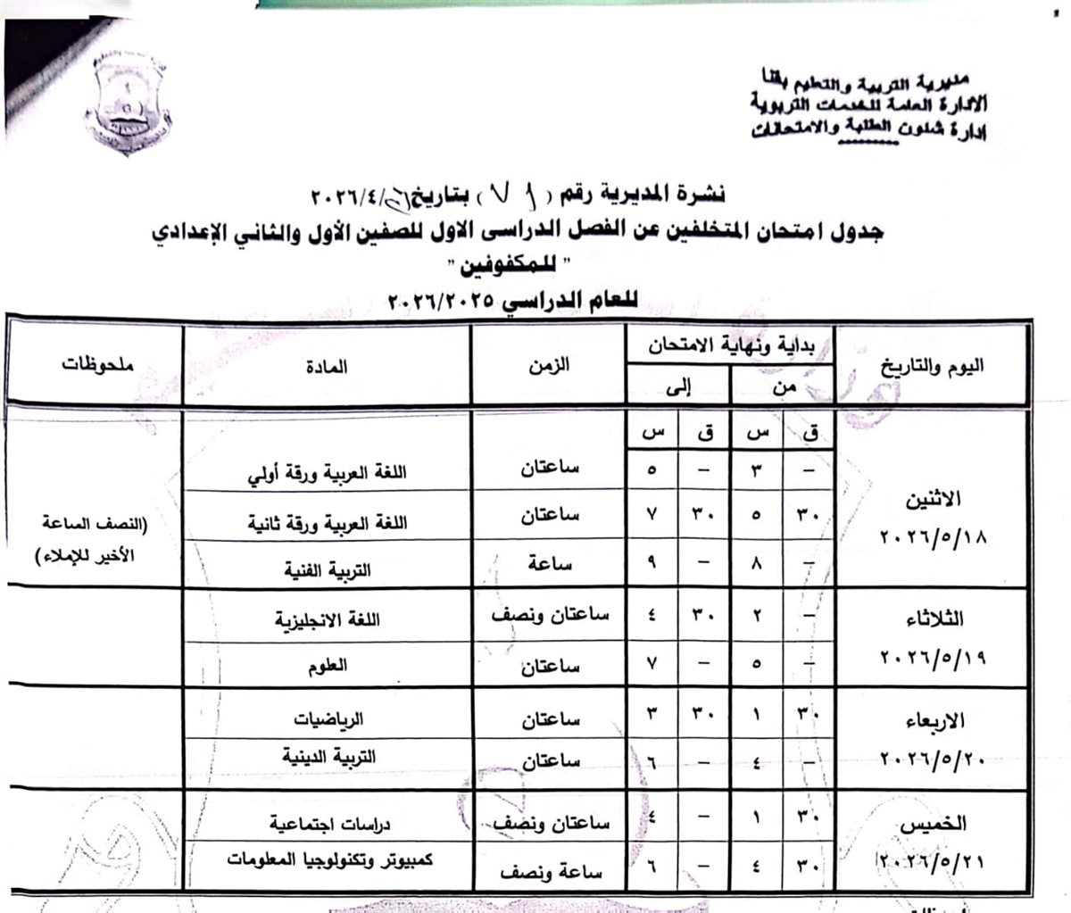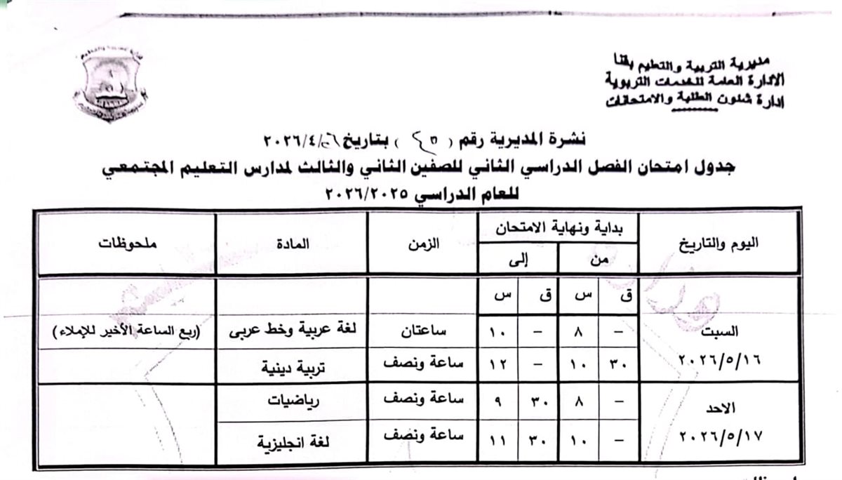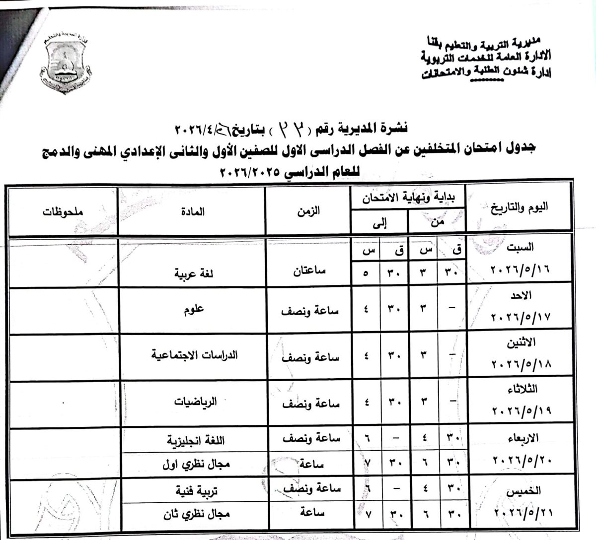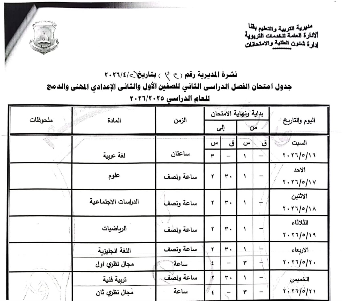 الصفين الأول والثاني الإعدادي (مهني): من السبت 16 مايو وحتى الخميس 21 مايو 2026.