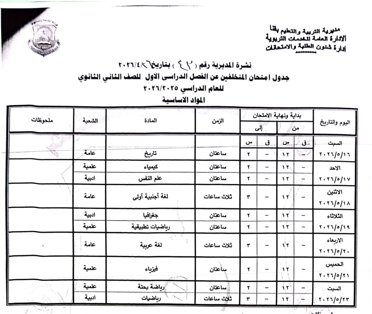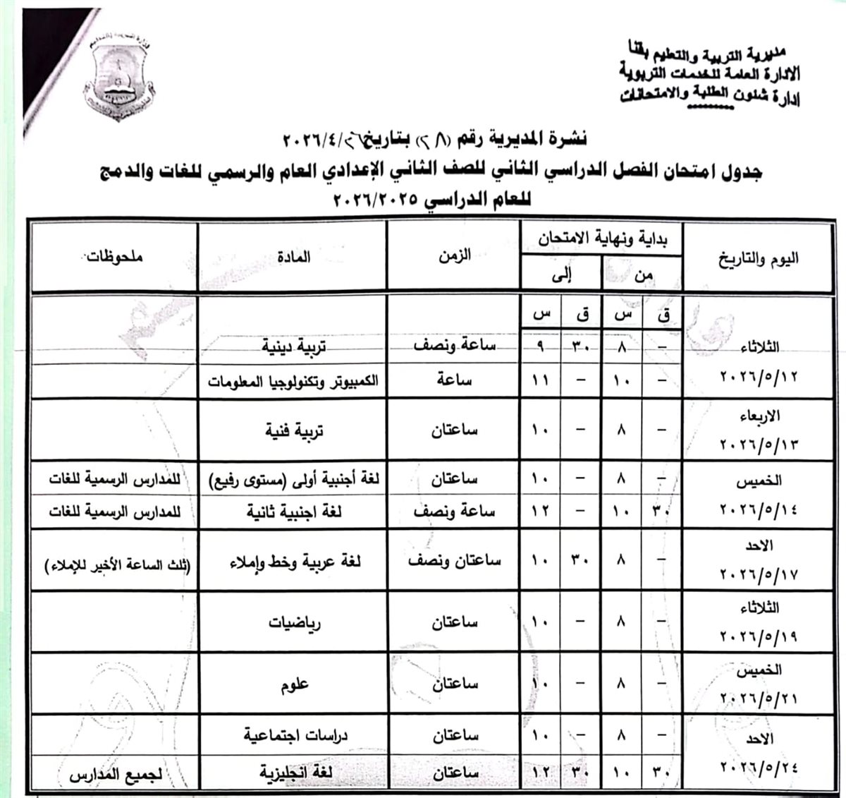 اعتمد اللواء دكتور مصطفى الببلاوي، محافظ قنا، جداول امتحانات الفصل الدراسي الثاني للعام الدراسي 2025 / 2026م، لمختلف المراحل التعليمية (النقل والشهادات العامة) على مستوى كافة الإدارات التعليمية بالمحافظة.