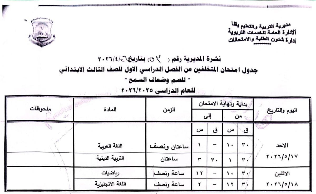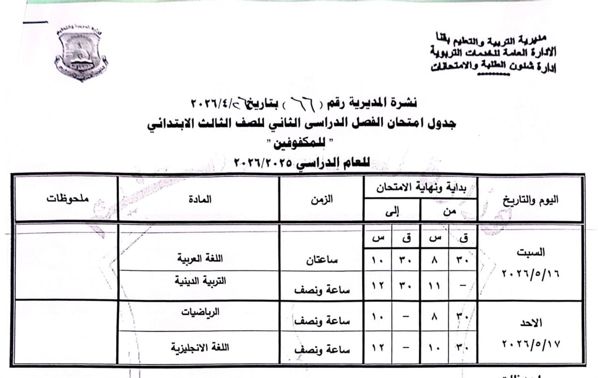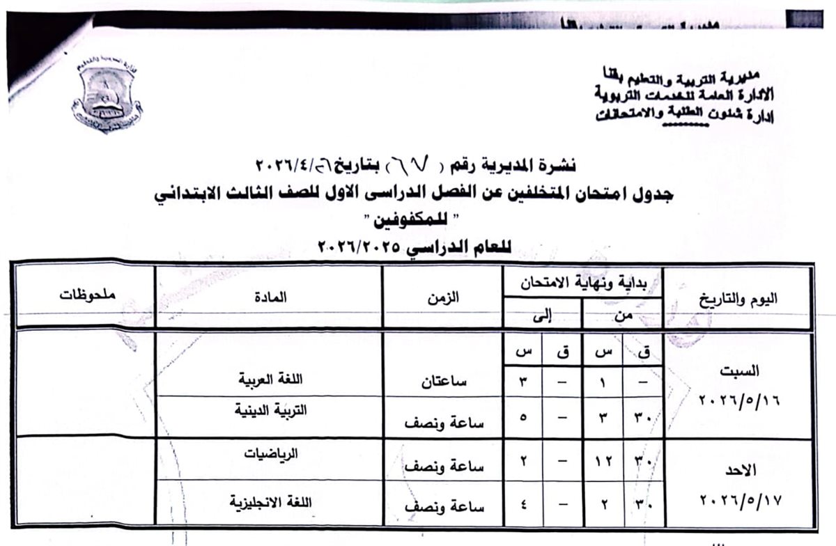 الصف الثالث الابتدائي: من السبت 16 مايو وحتى الاثنين 18 مايو 2026.