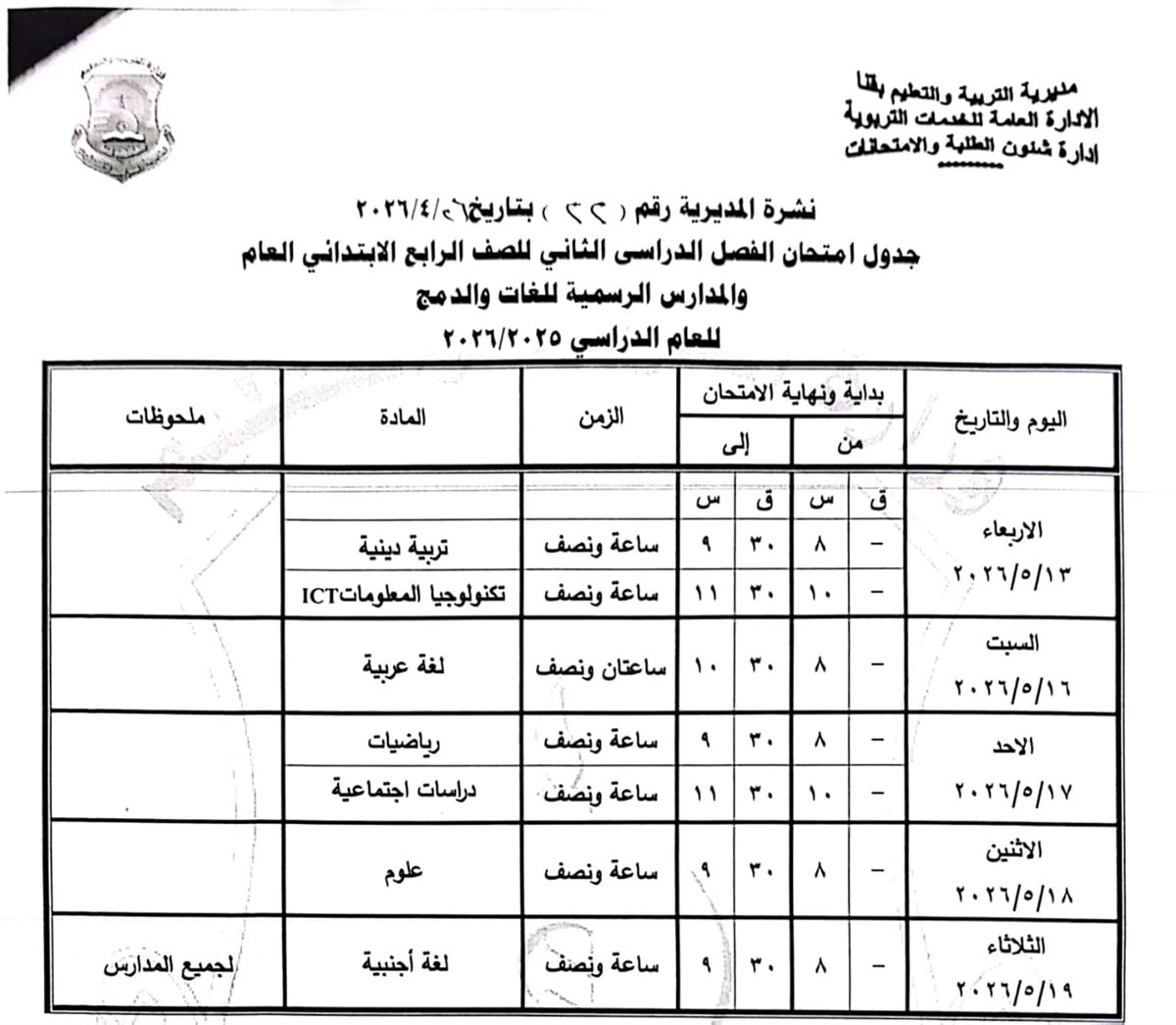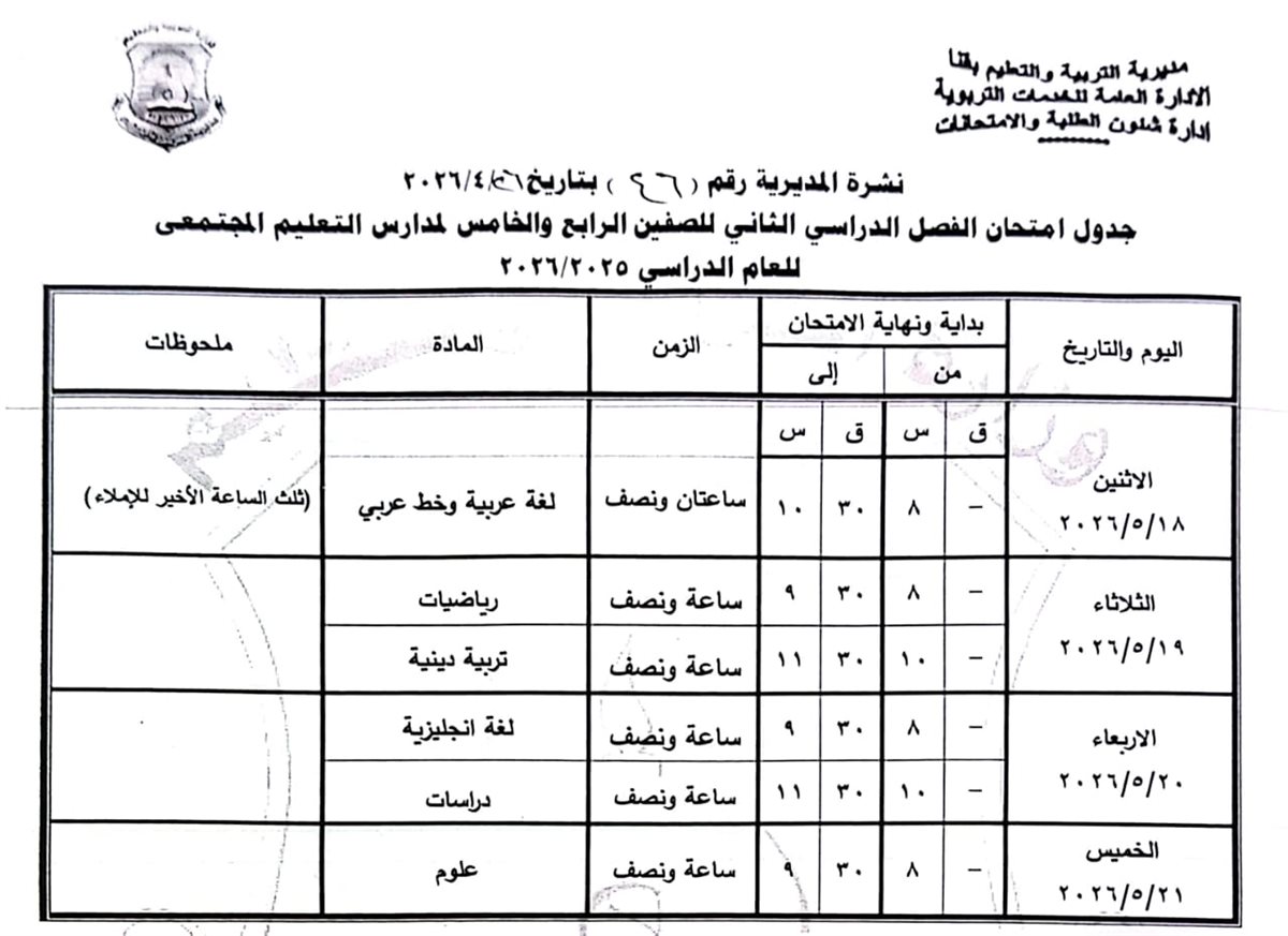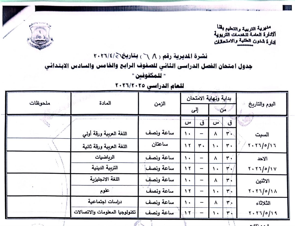 الصف الرابع الابتدائي: من السبت 16 مايو وحتى الثلاثاء 19 مايو 2026.