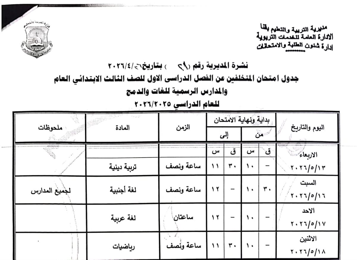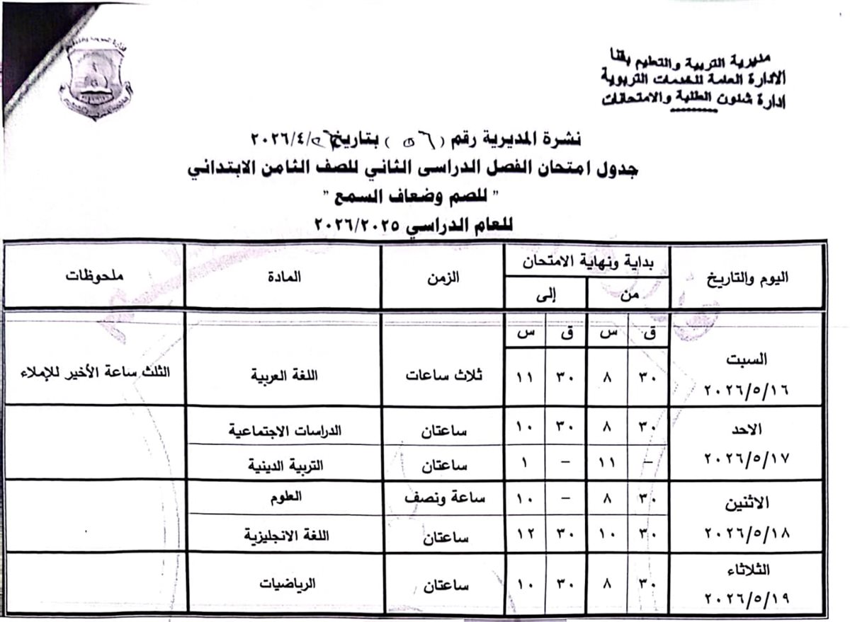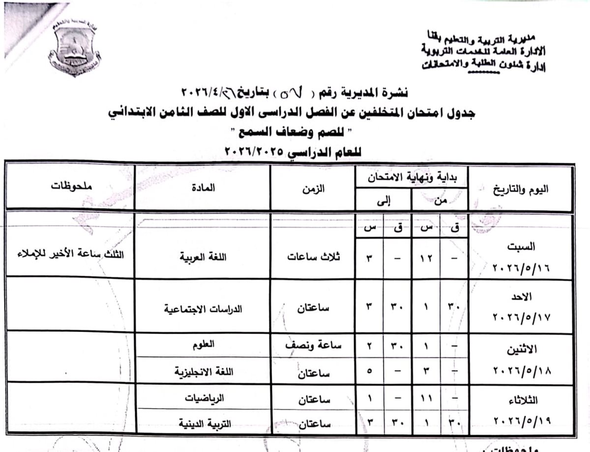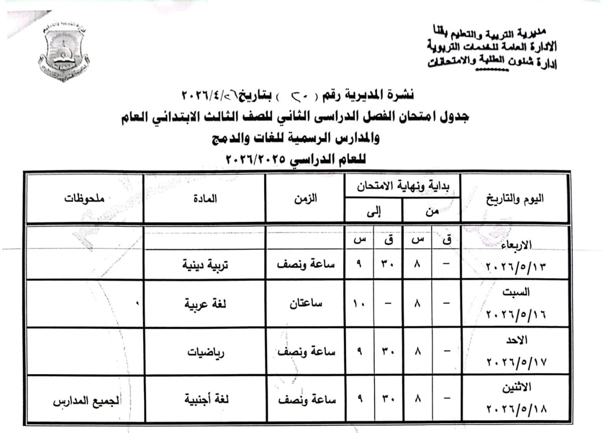 الصف الرابع الابتدائي: من السبت 16 مايو وحتى الثلاثاء 19 مايو 2026.