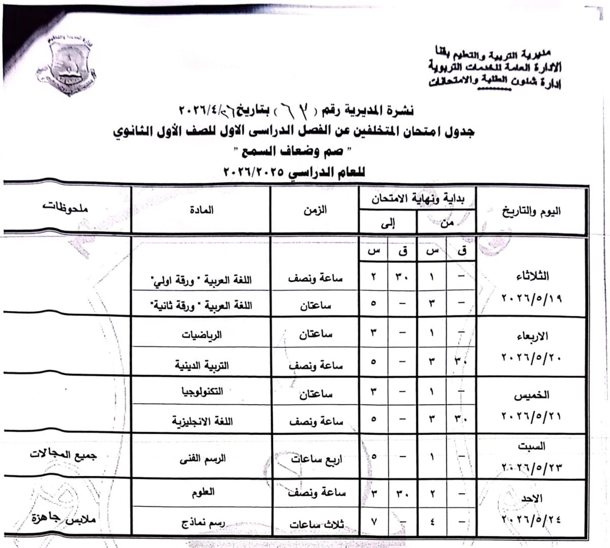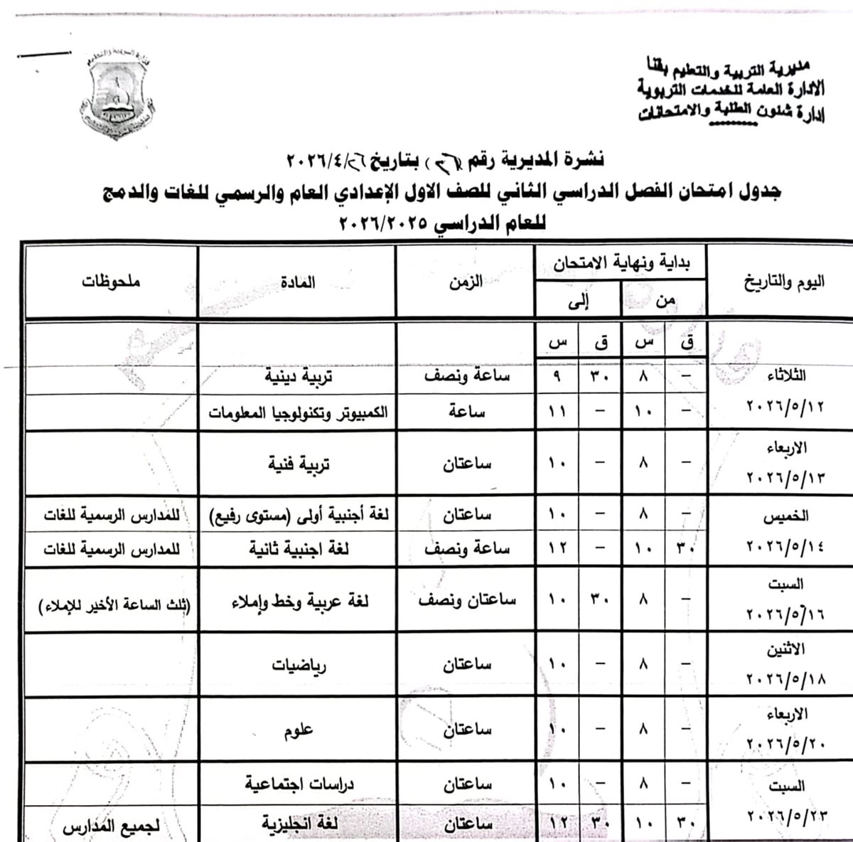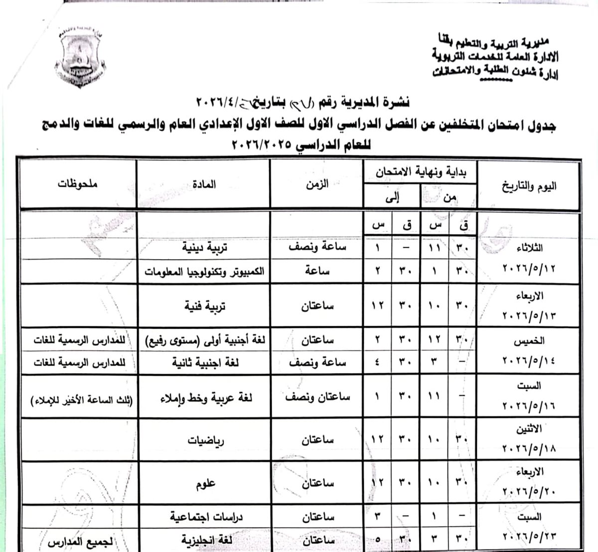 الصف الأول الإعدادي (عام/لغات): من السبت 16 مايو وحتى السبت 23 مايو 2026.