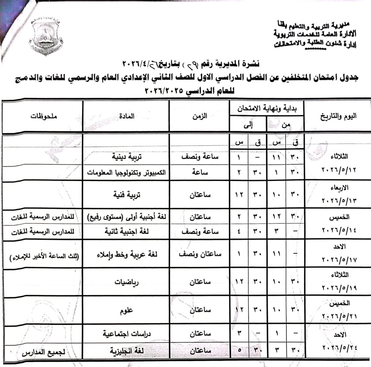 الصف الثاني الإعدادي (عام/لغات): من الأحد 17 مايو وحتى الأحد 24 مايو 2026.