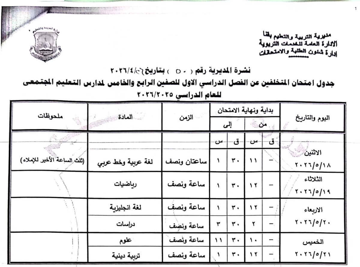 محافظ قنا يعتمد جداول امتحانات نهاية العام 2026 لصفوف النقل والشهادة الإعدادية