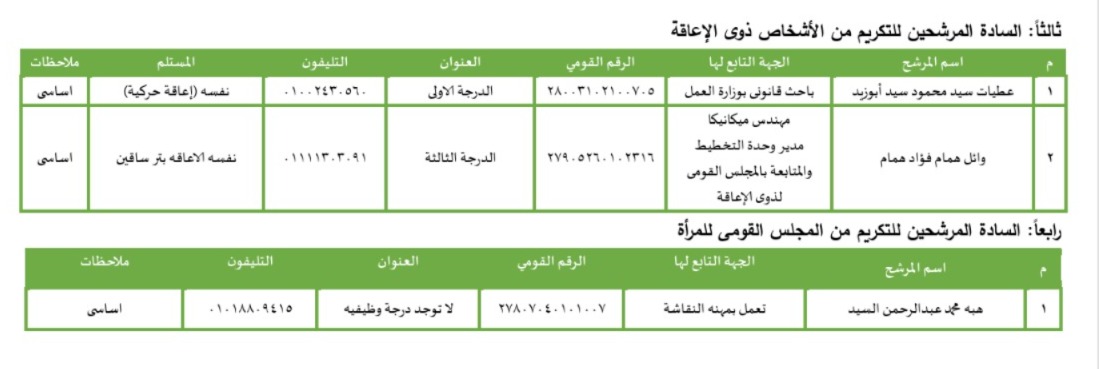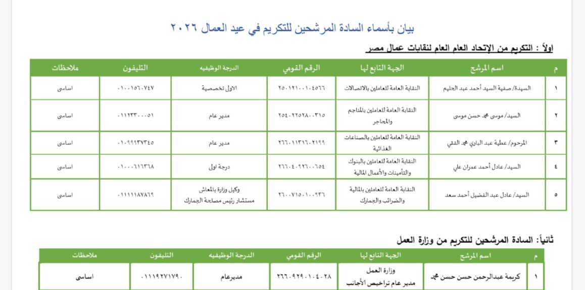 وفي إطار احتفالات الدولة بعيد العمال 2026، تم تكريم عدد من الرموز النقابية والقيادات العمالية، إلى جانب مكرمين من وزارة العمل والمجلس القومي للأشخاص ذوي الإعاقة، تقديرًا لمسيرتهم المهنية وإسهاماتهم البارزة في دعم قضايا العمال وتطوير بيئة العمل في مصر.