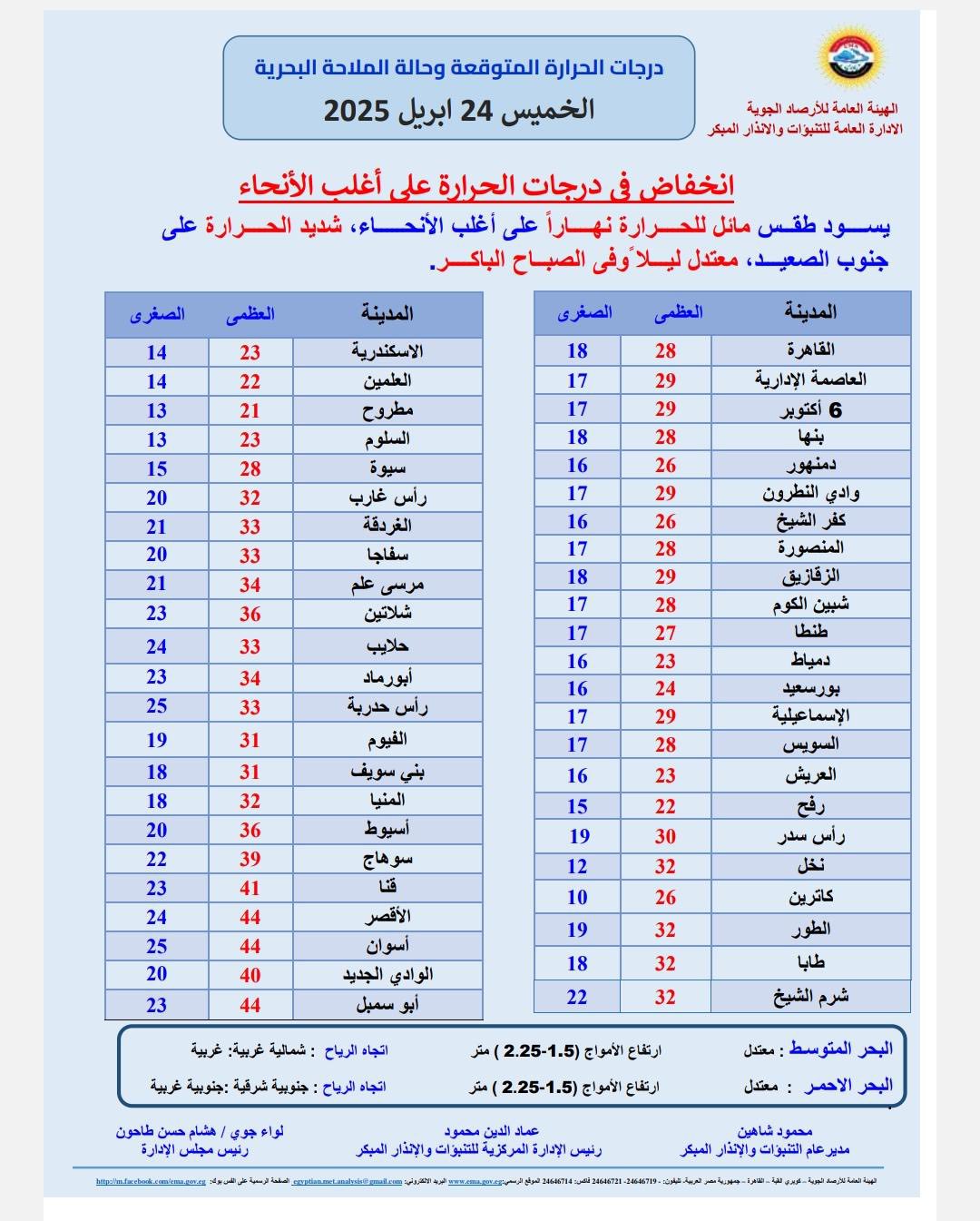 وإليكم درجات الحرارة المتوقعة اليوم الخميس على المحافظات والمدن المصرية: