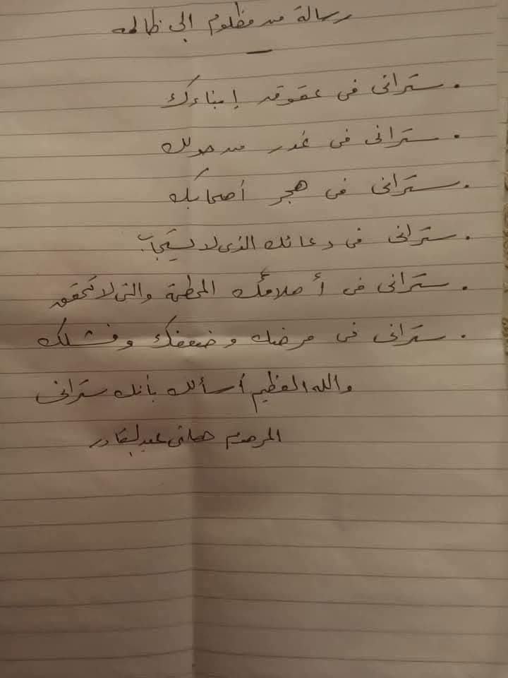 وجاء في الرسالة: "رسالة من مظلوم إلى ظالمه.. ستراني في عقوق أبنائك، ستراني في غدر من حولك، ستراني في غدر أصحابك، ستراني في دعائك الذي لا يستجاب، ستراني في أحلامك المحطمة التي لا تتحقق، ستراني في مرضك وضعفك وفشلك.. والله العظيم، أسألك بأنك ستراني.. المرحوم هاني".